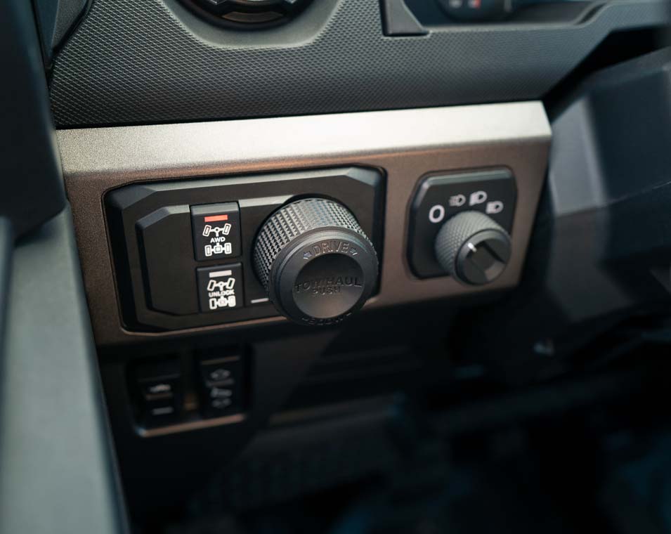 On-Demand True AWD/2WD/Turf/Ultra Turf, Drive Modes: Comfort, Standard, Sport, Tow/Haul, Equipped with creep in drive and reverse to help with low speed drivability for smoother power delivery